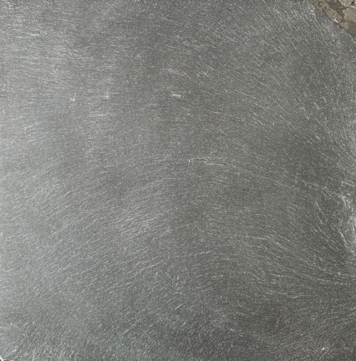 一味違う黒い粘板岩で中国から産出しています。漆黒ではない濃い色合いに薄めの粒子も混ざっています。緻密で固い石なので、防災性にも優れています。床面や屋外に適していて、ランダムな形状なので自由な組み合わせができます。