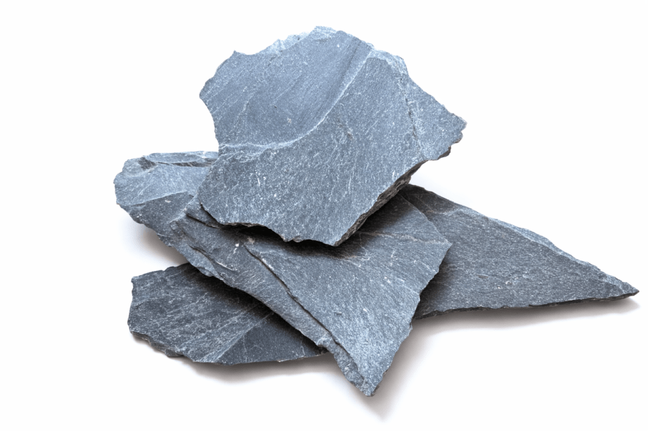青みを帯びた上品なグレーのスレートで、艶を抑えた自然な質感が際立ちます。層状に割れる石質と荒々しい割肌が独特の陰影を生み、薄く重なる板状形状が素材感と重厚さをより一層引き立てています。