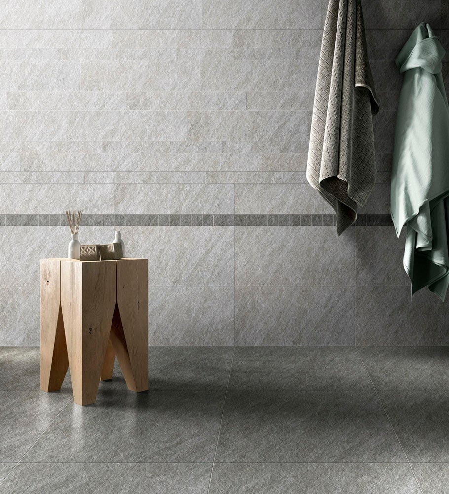 ●600×1200角、300×600角はタイルの性質上反りがあります。反りを目立たせないようにイモ張りまたはランダム張り(長辺の1/3以下のずらし張り)を推奨します。