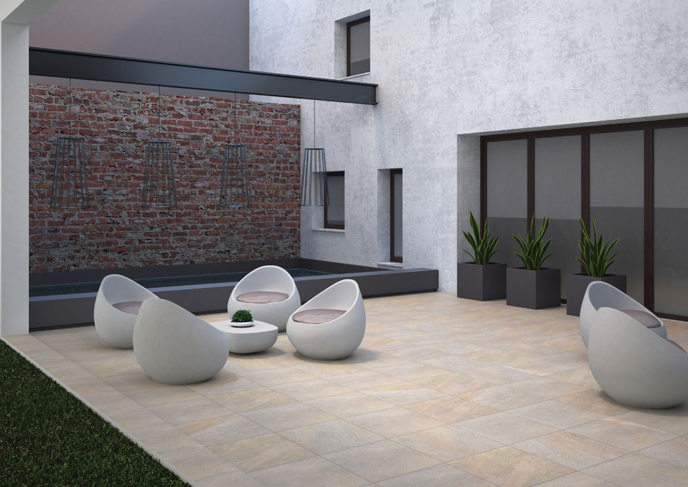 ●ラフグリップ仕上げ・・・グリップタイプよりもさらに粗めの質感と、より強い防滑性を持つタイル仕上げです。 表面の凹凸がより大きいため、濡れた環境や傾斜がある場所など、特に高い滑り抵抗が求められるシーンに適しています。 光沢を抑えたマットな質感はそのままに、安全性を最優先した仕上がりで、屋外階段・アプローチ・プールサイドなどで多く採用されています。ただし、表面の粗さが肌に触れるため、裸足で歩く場所での使用は推奨されません。