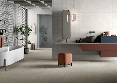 ●600×1200角、300×600角はタイルの性質上反りがあります。反りを目立たせないようにイモ張りまたはランダム張り(長辺の1/3以下のずらし張り)を推奨します。